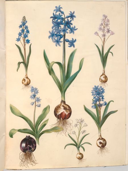 Curator: Standing before us is "Hyacinthus orientalis; Scilla amoena," a botanical study rendered between 1649 and 1659 by Hans Simon Holtzbecker. Note the meticulous application of watercolor, gouache, and colored pencil, showcasing a keen attention to detail. Editor: Oh, my! It feels like a secret garden on paper! A whisper of spring, captured in meticulous detail, as if he tiptoed into the garden with his pencils! Curator: Indeed. Holtzbecker presents these specimens—the Hyacinth and Scilla—with a scientist’s precision. The bulbs, roots, and varied blossom colors are all meticulously documented. The intention appears to be descriptive accuracy rather than subjective expression. Observe how the linear perspective and shading converge to emphasize form. Editor: Formality is right! I appreciate the dedication, of course, but wouldn't it have been rebellious, somehow, to give the flowers a story, let their leaves dance a bit more freely, instead of standing stiffly, ready for inspection? Imagine those blues swirling in the wind, narrating the secrets they overheard in the garden. Curator: You're suggesting an affective turn. While the temptation exists to imbue these representations with emotional narrative, consider them within the context of early scientific illustration. Accuracy and clarity served a very real, practical function. There's a functional beauty at play. The symmetry and organization are key elements here. Editor: Fair enough! I can almost smell the damp earth rising from the bulbs. Despite their static pose, these florals are very much alive in a way! Curator: This work is an elegant intersection of scientific study and artistic rendering from the Renaissance. I hope you appreciated it. Editor: I certainly did. Those serene blues really grow on you; quite grounding and inspiring all at once. I'll see these in my dreams, I think!
