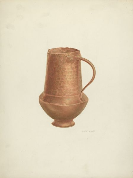 Curator: At first glance, it just makes me think of grandma's kitchen, you know? Warm, lived-in... something simmering on the stove. Editor: That's quite fitting actually. Here we have Edward Jewett's "Copper Kettle," a watercolor and pencil drawing on paper, created in 1937. Curator: '37, huh? So this kettle wasn't just an object, it was part of somebody's life during the Depression. Can you imagine what it witnessed? Family gatherings, hushed conversations, maybe even some shared tears? Editor: Absolutely. The very depiction of domestic objects can serve a political function, even implicitly. Focusing on the home can be a way to affirm shared values during uncertain times or simply document disappearing ways of life in rapidly modernizing ones. Curator: The little hammer marks, you see those? Each one is like a tiny human touch, and that’s something a photograph would never be able to capture. Editor: Indeed. The labor embedded in crafting the actual kettle, but also in Jewett's artistic rendering—it all points to an interest in valorizing everyday workmanship. Curator: There's a stillness too. A quiet dignity. Like this kettle has stories it’s not telling, you know? I can almost smell the tea brewing, ready to tell you every secret you ever tried to hide. Editor: It’s tempting to romanticize it, certainly, and there is a visual elegance at play, I'll give you that. The precise draftsmanship and use of watercolor elevate it beyond the purely utilitarian. Still, I keep thinking of the politics surrounding artistic portrayals of the home and hearth and the roles it played as a site of labor and refuge. Curator: It's more than just copper, isn’t it? It’s resilience. It’s warmth in the face of, well, everything. It’s holding onto something solid, even when the world outside is falling apart. And that is beautiful. Editor: Yes, it is a beautifully rendered reflection on simpler times and the endurance found in our most humble belongings. Curator: Almost makes you want to put the kettle on.