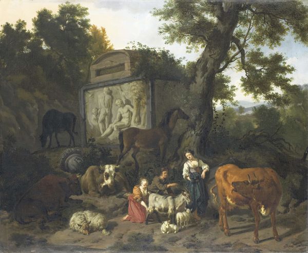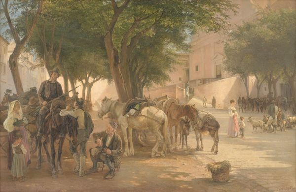 Editor: This is Charles Rochussen’s "De Requisitie," painted in 1872, using oil paint. The scene is busy, filled with figures and horses. The earthy tones and detailed rendering make it feel quite real. What do you notice about this work? Curator: The material choices speak volumes. Oil paint allows for this meticulous realism, mirroring the meticulous processes of 19th-century life. Consider the requisitions implied by the title, the taking of goods for military use. We must ask ourselves, what societal structures allowed this seizure? The painting almost presents this forced transaction as merely another everyday labour, normalized within a specific social hierarchy. Notice the artist's hand; how the material application of the paint simulates reality in a manner which obscures the artist’s physical involvement. Editor: So, you are less interested in the depicted narrative, and more in how the artist created the work and its link to social dynamics? Curator: Exactly! Look at the labor division represented here. Someone raised and trained that horse. Another person forged the officer's sabre. How is each person defined and valued based on these tasks and the system as a whole? Does this scene tell us anything about labour conditions at the time? About the process through which goods went from field to military use? The "how" often informs the "why," revealing power structures invisible on first glance. Editor: I see what you mean. By focusing on materials and labour, we can see the painting less as just a historical scene, but also a document that holds much information about social practices. Thanks, that was helpful! Curator: Indeed. Shifting our focus to how it's *made* rather than simply what it depicts really opens new avenues for interpretation.