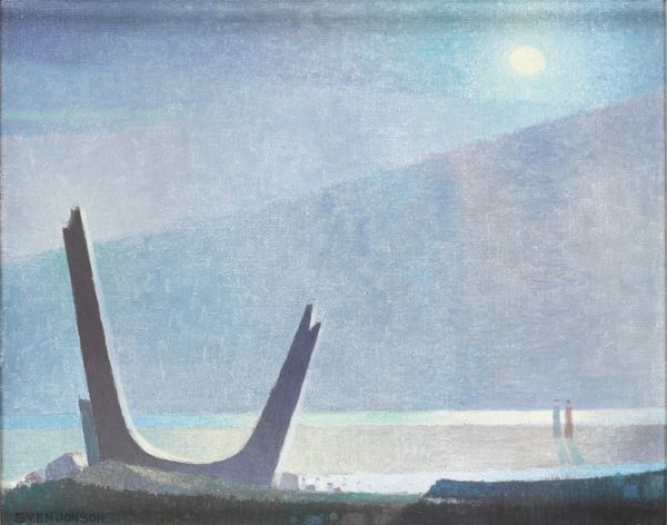 Owen Gent, of the 20th Century, created this work titled 'Svikaskáld – Sítrónur og Náttmyrkur' with an unknown medium. The dominant sensation is one of serene mystery. The composition is divided horizontally into three distinct registers: a dark sky scattered with stars, a body of water reflecting an ambiguous form, and bridging these elements, a whale floats horizontally, illuminated. The whale, rendered in soft lemon tones, appears weightless against the deep blue and green hues of the night. This juxtaposition creates a dreamlike quality, blurring the boundaries between reality and imagination. Gent employs a limited palette, which reinforces the thematic exploration of duality, contrasting light and dark, surface and depth. Gent's formal choices extend beyond aesthetics. The simplified forms and stark contrast hint at the symbolic depth inherent in the semiotic relationships between the whale, the night, and the water. This elegant reduction of form and color invites reflection on the interplay of the conscious and unconscious, revealing the sublime possibilities of a single image.