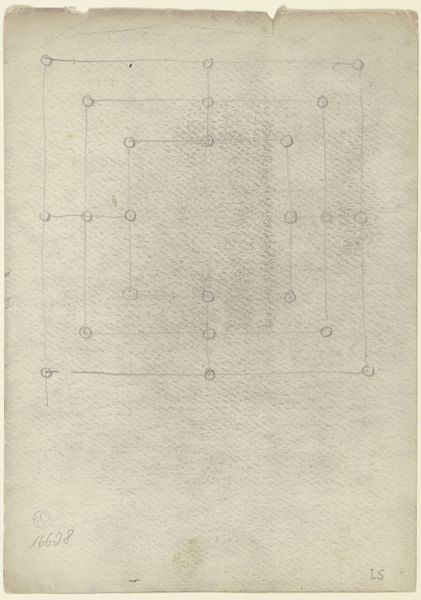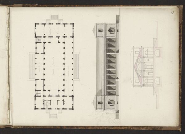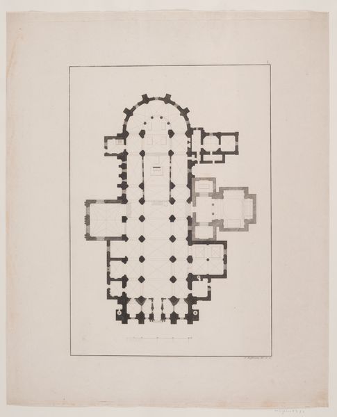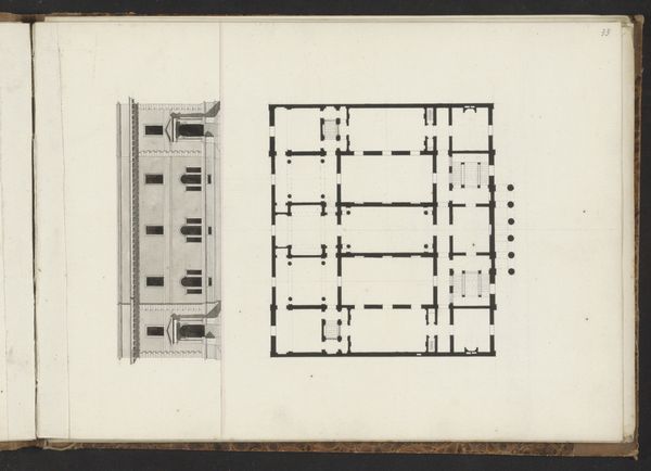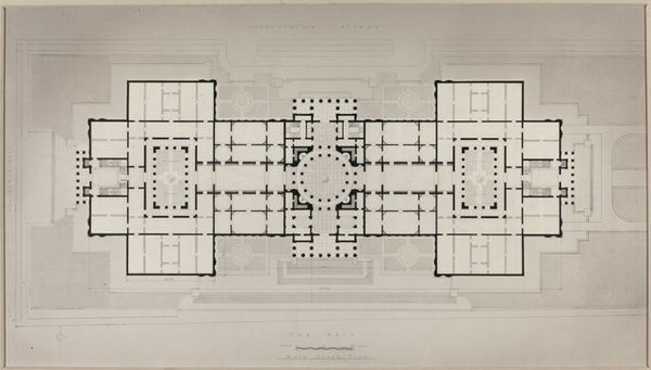 Curator: Today we’re looking at "Plattegrond," a drawing attributed to Willem Springer Jr., dating roughly from 1825 to 1907. Editor: My first impression is the stark symmetry; it's almost unsettling in its precision. It looks more like an abstract geometric exercise than a building. Curator: That's interesting, because these kinds of architectural drawings reveal so much about the aspirations of the era. They tell us about the values placed on order, planning, and social structures that shaped our environment. This almost looks like an ideal building for public service. Editor: And it is rigorously planned using paper and ink as media. It reduces architecture to its base components – line, angle, plane. What does this kind of flattening do? What does this remove from how architecture should be thought about? It focuses on utility and construction while minimizing surface ornament or material qualities. Curator: Precisely. We need to think of this as an artistic production but as a document created within the cultural sphere, intended for practical application. Who gets to plan the structure and who gets to occupy it? That division of labor should not be taken for granted here. The work itself represents that very power relationship! Editor: Good point. Seeing how simply and economically he represents stairs, or window wells, or room partitions suggests there might be multiple ways this floorplan could be implemented given diverse materials at different times and places. How much are social relations built right into this basic frame? Curator: Without careful execution with the available materials the architectural plans could just be useless marks on the page. The building must reflect the socio-economic reality and that labor process of material implementation of that blueprint! Editor: Seeing this, I am realizing it can be useful and lovely simultaneously. Curator: A testament to when architecture intersects with design.