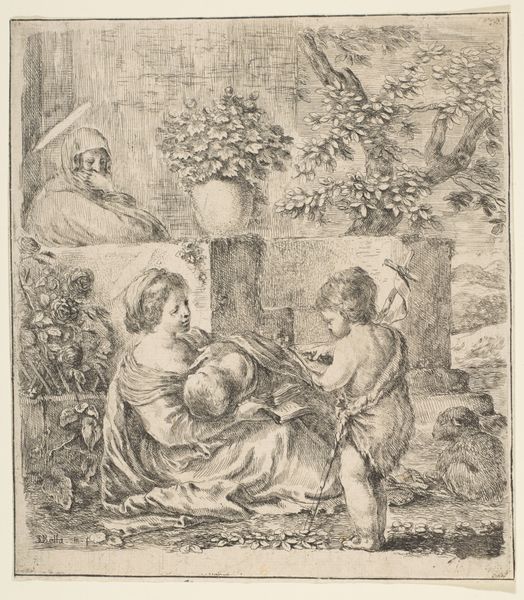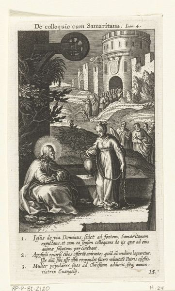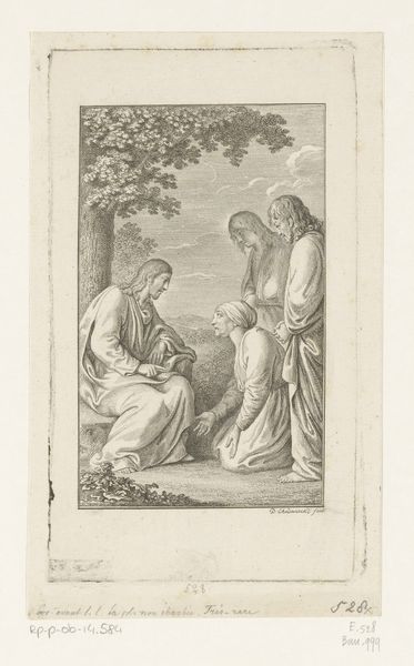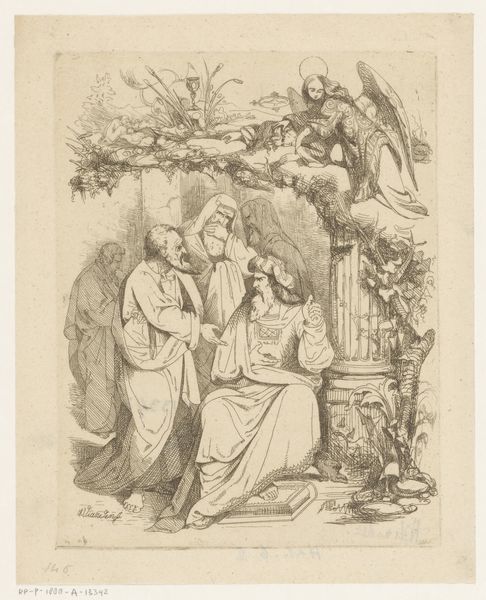 Curator: Looking at this intricate etching by Heinrich Vianden, created around 1844, one can't help but be struck by its almost dreamlike fragility. Editor: Yes, an initial sense of subdued, mournful atmosphere washes over me. It’s the tonal range; mostly pale grays punctuated by small, sharp areas of darker ink. The figures appear lost in contemplation, rendered in delicate lines that create a rather ghostly effect. Curator: Indeed. This piece, entitled "Zeven dwaze maagden wachtend op een bruidegom," or "Seven Foolish Virgins Waiting for a Bridegroom," directly illustrates a parable from the Gospel of Matthew. Vianden, in choosing this subject, aligns himself with a broader 19th-century artistic trend of representing biblical narratives as moral lessons for society. Editor: The composition is quite clever, too. See how Vianden uses the architectural framework – the arch and crucifix – not just as setting, but as compositional anchors? Our eyes are guided through this structured space and toward these dejected figures, slumped and huddled together. It's a study in creating emotional depth through simple, precise linework. Curator: And think of the context of this work: mid-19th century, an era defined by social and religious upheaval. Images such as this served a crucial function, providing narratives to reinforce communal values and reinforce social norms surrounding faith, obedience and feminine virtues. Were these women truly foolish, or just ill-prepared for a socially defined role? That’s a reading that speaks to broader anxieties of the era. Editor: The distribution of light also serves the reading of it, emphasizing a spiritual rather than literal source for illumination. This is what separates it from pure illustrative work and brings the print into a distinct art context. Curator: Agreed. What strikes me most is how Vianden, working within the confines of a traditionally religious theme, manages to hint at larger societal critiques regarding expectations imposed on women. Editor: It is compelling to appreciate the way formal design choices can give us an interpretive lens into greater cultural and social understandings. Curator: Absolutely, understanding this piece allows us a brief yet profound reflection on the social role that artworks play in communicating ideas across time.