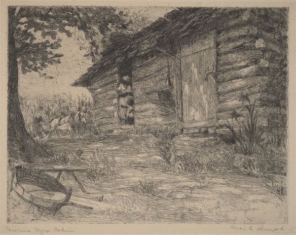 Curator: Let’s turn our attention to Karl Metzler’s pencil drawing, “A. T. and T.,” created around 1936. It’s a quintessential example of American Regionalism. Editor: Well, first impression: desolation. It feels lonely and silent. It’s all grays, even the sky looks like a whisper. This poor rickety building, the ground feels so barren, only to be interrupted by a telephone post... Curator: Exactly. That juxtaposition is key. Metzler positions this rustic, almost obsolete barn against the looming presence of the telephone pole. It's a stark commentary on the encroachment of modernity onto rural landscapes. Editor: The texture is what grabs me. See how he uses the pencil to create this layered effect, like dust motes dancing in fading light. He's really capturing the grit of this place, this particular slice of time. I bet he grew up in an isolated village somewhere. Curator: The artist did, and I appreciate you mentioning texture, which further embodies the harshness and resilience of the Midwest during the Depression era. We could delve into how New Deal policies promoted electrification in rural areas—the promise and threat inherent in technological advancement. Editor: That’s interesting—you always contextualize everything through history, whereas I'm just trying to get inside the mood, which is heavy as the wooden boards on the structure! I suppose one interpretation is that it evokes an imminent collision between human-scale life and technological force. Curator: That perspective has roots in critical theory. Think about issues surrounding land use, industrial expansion, economic inequality...Metzler, whether consciously or not, has given us an artifact rife with these anxieties. Editor: Still, let’s acknowledge that the work contains beauty, however grim. There's strength in its simplicity, in that unblinking gaze. Metzler saw something valuable there, right before progress erased it forever. Curator: In essence, a potent visual elegy to a fading way of life. Editor: Yes. An echo in gray, whispering of transformation and loss.