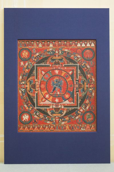 This is an anonymous painting on cloth of a Chakrasamvara and Vajravarahi Mandala. The composition is dominated by concentric geometric forms and the symmetrical arrangement of figures. Notice the vibrant reds, blues, and greens; these bold choices create a pulsating visual field that draws the eye inward. This mandala uses structure and form to symbolize complex spiritual ideas. The square, a grounding element, represents the structured cosmos, while the inner circle signifies the dynamic, boundless nature of enlightenment. The figures arranged in a pattern around the central deities are not merely decorative; they form a matrix of symbolic relationships. The mandala can be seen as a structured system of signs. The geometric shapes and figures function within a symbolic framework, which suggests a deeply coded representation of Buddhist philosophy, a guide for meditation and spiritual transformation.