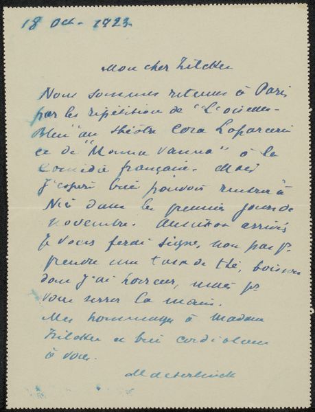 This is a page from the archive of Philip Zilcken, dated September 11, 1916, and now held in the Rijksmuseum. It provides a glimpse into the social networks of artists and writers in early 20th century Europe. The note itself is in French and references correspondence related to the poet Mistral. It mentions a visit in October 1904 to Avignon, carrying a letter of introduction to Mistral. The writer, V. Hébert, describes a radiant journey through the countryside, only to find the poet absent. Shortly after, he receives a postcard of the "Joconde", containing a reproduction of an etching. This archival fragment reveals the importance of personal connections and artistic exchange within the cultural landscape of the time. To fully understand its significance, one might consult Mistral's own writings, or delve into exhibition catalogues and other printed ephemera related to Zilcken and his circle. Such research can illuminate the social and institutional contexts that gave rise to this moment of artistic encounter.