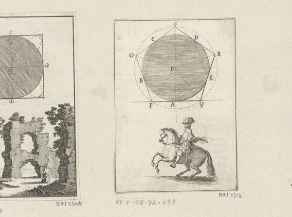 Editor: So, this engraving by Sébastien Leclerc I from 1669, titled "Beschrijving van een ovaal op twee gegeven diameters met onderaan een man met mantel," depicts geometric figures with a cloaked man underneath. I find the combination of the mathematical and the human somewhat unusual. What do you make of this juxtaposition? Curator: I see this print as a fascinating intersection of power, knowledge, and representation in the 17th century. Look at how the geometric diagrams are presented as an objective truth, almost literally placed 'above' the figure. How might this represent the era’s emerging scientific dominance, subtly influencing the role, even the perception of the individual? Is the man in the cloak included to demonstrate scale, or does his presence point towards a certain disconnect between theoretical knowledge and lived experience? Editor: That's interesting. He seems almost alienated from the knowledge above him. Could there be an element of social commentary here? Curator: Exactly. Consider the cloak. Who wears such garments? Scholars? Religious figures? Is Leclerc subtly critiquing the power structures inherent in accessing and disseminating knowledge? Who had access to these geometric principles and how did that affect the social hierarchy of the time? Also, observe the landscape visible in the background. Who is allowed to simply look into knowledge versus have knowledge thrust upon them? Editor: I never considered that the artwork could contain those social narratives, I was too busy viewing them together. Curator: Exactly! These images act as reflections of broader societal currents, prompting questions about access, agency, and the construction of authority. What does the image say, by showing it this way? Editor: I see the artwork now in a different light! Thank you! Curator: It’s been a pleasure! Let’s delve deeper into art’s connection with societal structures during our next meeting.