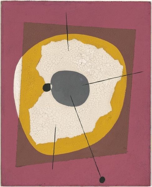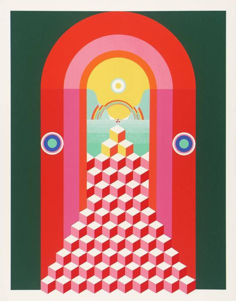 Curator: Here we have Michael Rothenstein's "Green Pagoda" from the Tate Collections. Editor: My first impression is quite striking. The concentric circles dominate the composition, creating a dynamic tension with the pagoda image below. Curator: Indeed. The careful arrangement of color and form leads the eye. The circles, rendered in varying hues, echo the pagoda's structure, yet abstract it. It's a compelling interplay of signifiers. Editor: I'm curious about the printing process. The textures evident in the purple background and orange blocks suggest a hands-on, crafted approach, almost a collision of mass production and individual labor. Curator: Precisely. Rothenstein often explored the intersection of traditional printmaking techniques with modern abstraction, prompting us to reconsider our understanding of image-making. Editor: The juxtaposition feels deliberate, highlighting how the cultural symbol of the pagoda is re-presented, re-materialized through modern methods. Curator: Ultimately, Rothenstein invites contemplation on the shifting landscape of cultural symbols, their reproduction, and our engagement with them. Editor: It's fascinating how the piece bridges the gap between the spiritual and the manufactured, forcing us to reconsider the value we place on both.