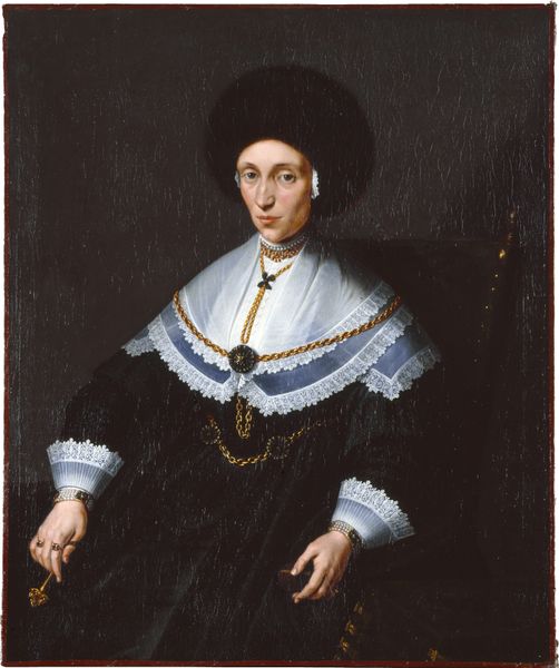 Curator: Welcome. We’re now standing before a portrait identified as Catharina van Well, wife of Guilliaam van Bleyswijk. It was likely painted by Gerard van Kuijl sometime between 1640 and 1660 and gives us a glimpse into the world of the Dutch Golden Age elite. Editor: Golden, eh? I immediately felt like I was peering into a Vermeer painting—something about the lighting, or perhaps just the air of restrained wealth. Curator: Yes, while not explicitly verified, this work echoes the prevailing aesthetic of Dutch Baroque portraiture, marked by detailed realism and understated opulence. The choice of dark oil paint emphasizes texture, and likely was to create drama through contrasts with lighter materials. These artists often relied on natural light within domestic spaces to make an impact. Editor: Those details, especially the lace collar and the pearl jewelry, practically jump out at you. She looks so composed, so utterly...still. And yet there is something playful. Perhaps the angle she is holding her folding fan? She is an icon but something feels different about her. Curator: Her dress certainly speaks volumes about her status within the household. While displaying refinement and economic success through precious accessories like pearls and detailed ornamentation, we need to remind ourselves that during the time of production these choices signified more than personal preference: they reflected familial allegiances and affirmed one's position in Dutch society. Editor: I’m fascinated by the quiet strength in her gaze, you know? There's a worldliness about her that makes me want to know her secrets. Or at least what book she is reading when out of view from this sitting. Curator: Indeed. Portraits of this era were intended as much more than likenesses; they functioned as testaments to lineage and civic responsibility. Van Kuijl captured her likeness but equally wanted to depict Catharina van Well in line with society’s ideals. Editor: What a weight to carry in a portrait. To know your persona is more than an honest expression of yourself but a signal to the world that you matter, and that others who look and dress like you matter too. All this just bubbles to the surface looking at this Baroque pearl of a painting. Curator: Absolutely. It provides ample room to reflect upon themes of gender, privilege, and the very nature of representation in the 17th century. Editor: I concur. After close viewing of Catharina, I realize her silence shouts loud enough to inspire discourse between generations.