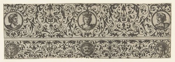 Editor: This artwork, made sometime between 1528 and 1580 by an anonymous artist, is called "Smal fries met moresken, in het midden een mascaron met hoofddoek." It’s an engraving, giving it this precise, linear quality. What do you see in this piece? Curator: Immediately, I see the confluence of materials, labor, and the socio-economic contexts that informed its creation. Consider the production of prints at this time. Engraving allowed for mass production, making designs like these—meant to mimic Moorish ornamentation—available to a wider audience. Editor: So, you're focusing on how it was made and who it was for. I guess I was more drawn to the repeating patterns, the geometric shapes intertwined with these leafy, organic forms. Curator: Exactly. And who had access to these skills? Who controlled the means of reproduction, and for what ends? Look at the title: "moresken" suggests Moorish influence. Consider the cultural exchange—or appropriation—happening through trade and printmaking during the Renaissance. What sort of workshops were responsible? Editor: That's a good point, thinking about the labor involved in creating these decorative prints. It moves beyond just admiring the aesthetics. It’s almost like a branding effort, to give an impression to certain items. Curator: Precisely. These weren't just idle artistic expressions; they were commodities circulated in a market shaped by global exchange and early forms of industrial production. Understanding that material reality shifts our perception of the "art" itself. Editor: I never thought of it that way. It gives new significance to what seemed like simply decorative elements. Curator: And, seeing those material connections really contextualizes these engravings, placing them firmly within the web of early modern consumption and artistic production. Thanks for bringing your perspective.