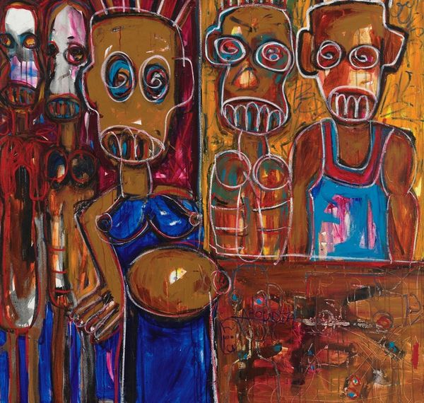 Editor: So, here we have Zeng Fanzhi’s “Mask Series”, an intriguing acrylic on canvas work. There’s a group of figures wearing unsettling, mask-like smiles. Despite the seemingly cheerful facade, there’s something unsettling about the uniformity. What exactly do you see in this piece, and what's your take on that jarring contrast? Curator: Well, my friend, isn't it the theatrical stage of life itself, painted in broad, bold strokes? To me, Zeng is holding up a mirror, reflecting back our own performances. He’s showing how we sometimes hide behind social masks, perhaps to conform or to protect ourselves. That vibrant yellow backdrop, almost aggressively cheerful, amplifies the irony. It asks: are these children genuinely happy, or are they just playing their roles? Notice how each mask, while similar, possesses unique cracks, slightly different expressions. Editor: So you see a commentary on conformity? I’m struck by how the red scarves – like symbols of youthful innocence – clash with those stark masks. It's disturbing. Curator: Disturbing is precisely the sensation Fanzhi wanted to evoke, I think. What could these masks hide, conceal? The anxieties, uncertainties, maybe the crushing weight of societal expectations, all while plastered with an ever-smiling mask. Editor: That's such a compelling interpretation! I hadn't thought about societal pressures that way before. Curator: Art whispers truths in disguises, darling. And this one screams with a disquieting grin. Food for thought, isn’t it? Editor: Definitely food for thought. I'm leaving here seeing not just masks, but stories behind them. Curator: Precisely, and maybe, just maybe, recognizing our own reflection there too. The most rewarding thing about art.