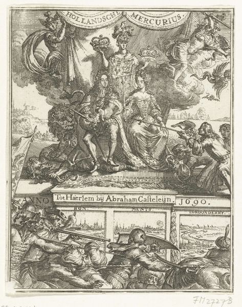 Editor: This is "Allegorie op de natuur en schilderkunst," or Allegory on Nature and Painting, made sometime between 1618 and 1655 by Cornelis Schut. It's currently held at the Rijksmuseum. It appears to be an ink drawing, a very detailed one at that. The overall feeling I get is one of... contained exuberance. There's a lot happening in a small space. What do you see in this piece? Curator: Let us observe closely how the artist utilizes line and form. Notice the dramatic tension between the robust figures in the foreground and the delicate rendering of details in the backdrop. The composition adheres to the prevailing Baroque aesthetics. Each element seems purposefully placed to guide the viewer's gaze. Can you see how the curves in the figures echo one another? Editor: Yes, I do. It's almost like a series of interconnected 'C' shapes that draw my eye around the whole image. What about the figures themselves? Do they represent something specific, beyond just "nature and painting?" Curator: Consider them instead as arrangements of shapes and lines, functioning as formal devices. The interaction between light and shadow further enhances the textural qualities, no? See how the dense hatching defines depth and volume. The subject may be allegorical, yet the true interest resides in its formal construction. Editor: That's a different way of seeing it than I was expecting, but it makes sense. So, less about "meaning," more about how it's put together and how the forms relate? Curator: Precisely. A study in composition and technique, celebrating the act of representation itself. What began as allegorical may very well translate into an impressive arrangement of line and forms, transcending period styles. Editor: Okay, I think I get it. It's not just what's being shown, but how the artist chooses to show it through lines, shading and composition, regardless of time and cultural context. I'll be looking at drawings a bit differently now.
