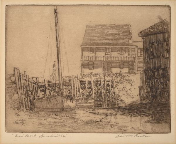Percy F. Albee made this print of boats docked at a harbor sometime in the first half of the 20th century, using a graphic approach with strong, almost brutal marks. There's a real directness to it, the way he lets the marks stand for things – a scribble for a bush, a heavier cluster for the pilings in the water. I really get a sense of Albee embracing the process of artmaking and revelling in the textures he can achieve with such a limited palette. Check out the lower left corner, see how the marks almost dissolve into abstraction? It’s like he’s saying, "this is just ink on paper," even as he creates this convincing scene. The rough texture reminds me of some of James Ensor's prints, that same willingness to let the medium do its thing. It's a reminder that art is as much about the making as it is about the image. A conversation about the relationship between the world and the image.