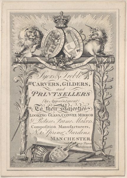 Editor: This is a trade card for the late gunmaker John Knubley, dating from the 1790s to early 1800s. It's an engraving, and what strikes me is how densely packed the design is, a real feast for the eyes. What's your take on the composition of this print? Curator: Indeed. Notice the rigorous symmetry that anchors the design. The central oval containing the inscription acts as the primary structural element. Observe how the heraldic lion and unicorn mirror each other above, framing the royal coat of arms, themselves balanced visual anchors. Note the counterpoint created by the weaponry placed asymmetrically around the central inscription; yet, these seem placed to counterweight each other in a subtle visual dynamism, achieving resolution by culminating in the rifles crossed at the bottom. How do you interpret this arrangement? Editor: I see that, the way the swords and rifles echo each other creates a sort of visual harmony despite the asymmetry. The typography, too, seems very deliberately placed, contributing to this formal balance. Curator: Precisely. The lettering style itself denotes authority and speaks to the trade's clientele. What is more, the varied font sizes create a sense of hierarchy that emphasizes "Sword Cutler & Gun Maker," visually mirroring the social and economic hierarchy it serves. Did you also observe the significance of negative space in emphasizing these details? Editor: That's a good point, it creates that formal structured mood of the piece! Thanks. Curator: It has been a delight.