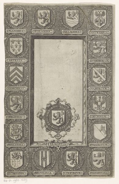 Editor: Here we have a tile panel made between 1654 and 1679, carrying the coat of arms of Johan Maurits of Nassau-Siegen. I am fascinated by the monochrome quality of it, it feels weighty and formal, despite being relatively small. What are your thoughts on the impact of the tile's materiality? Curator: The selection of metal as the medium speaks volumes. Metal’s inherent qualities, such as its durability and malleability, facilitate the creation of intricate relief. This tactile element enhances the viewer's engagement. Note the crisp lines and well-defined shapes of the arms: Crown, lions, even the scripted text. It is a deliberate compositional strategy emphasizing visual clarity and conveying a sense of authority and permanence. What do you see when you consider the layout itself? Editor: Well, the symmetry strikes me. The arms are centrally placed, flanked by what look like floral elements. Everything is very contained within the square format of the tile. Curator: Precisely. The formal, almost rigid, composition reinforces the heraldic symbolism. The arms act as a focal point, drawing the eye to its various emblematic components. Each shape has meaning, acting like signifiers, coming together in the visual construction of power and lineage. The overall aesthetic, a controlled display of wealth and prestige, relies not on ornamentation, but structural elements within the artwork itself. Does analyzing the form influence your first impressions? Editor: Yes, definitely. Focusing on its pure visual elements has removed some of my prior assumptions of context. I now appreciate its meticulous arrangement more deeply! Curator: Indeed, focusing on the construction and composition yields richer understandings, independent of contextual data, to explore its fundamental visual language.
