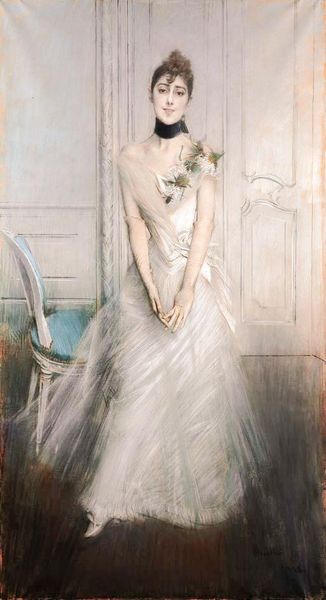 Curator: Looking at Alfred Stevens’ "Winter" from 1877, it offers a glimpse into the world of late 19th-century elegance. Editor: Ooh, a little frost fairy getting ready for the ball, I see. Everything is draped in icy whites and blues – even the light seems hushed and shimmering. Curator: Indeed. Stevens was known for his genre paintings depicting fashionable women in domestic settings. He had an understanding of the socio-political context of women in this time. We can notice the symbolism of the mirror as an object of bourgeois narcissism in his work. Editor: Narcissism, perhaps, or just plain old pre-party jitters. Look at how he’s captured the subtle tension in her pose. One hand on her hair, the other clutching her dress...that's not a confident woman, that's a hopeful one. There is something very personal about this, like she knows exactly who is at the ball tonight, someone special. Curator: You read that inner-narrative very clearly. It's key to remember Stevens' place within the artistic and social conventions of his era. Her attire, those cascading ruffles and jewelry, denote a certain level of class. And her positioning in relation to the mirror plays to prevailing notions of female beauty as a social construct. Editor: Social construct or not, she's hoping to catch someone's eye! And the muted tones help focus your gaze – a soft stage spotlight effect, almost theatrical, which may speak for Stevens own interest in stage decor. She looks like she is the protagonist. Curator: And, of course, it would be remisiss not to see that "Winter" functions as a piece of social commentary about the era and about femininity within certain classes. We might debate as to whether the picture reveals feminist intention but this only complicates a discussion that is much needed to tackle misogyny across institutions. Editor: Well, I will stick with my own point and keep things a little lighter. It is so very interesting to find such intimacy and excitement on display through simple observation. Makes you wonder what the artist knew, or hoped. Curator: Indeed, seeing how art echoes cultural debates makes observing easier to understand as part of society as a whole. Editor: And just for once, art simply mirrors the simple beauty of expectation.