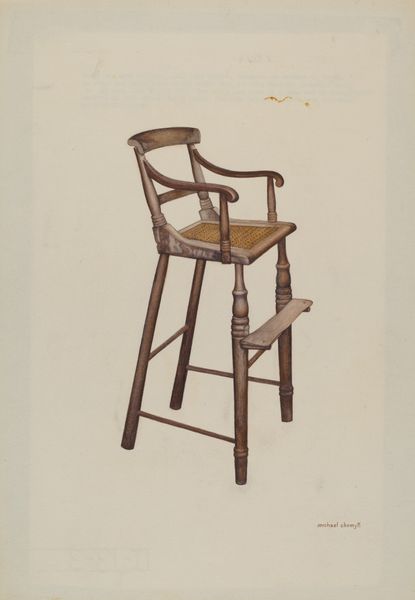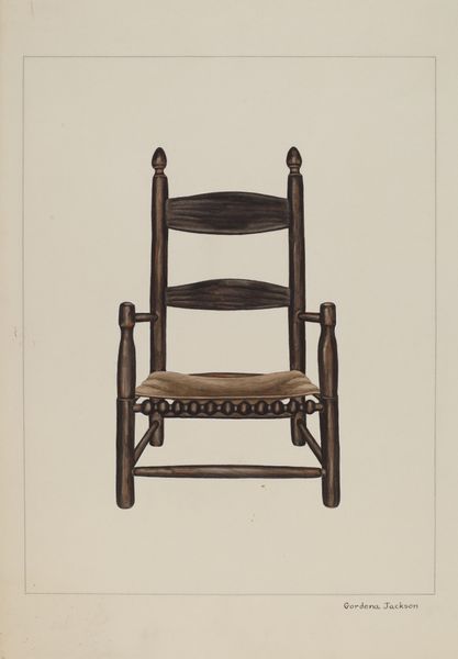 Editor: We're looking at John Cutting's "Ladder Back Chair," created around 1939, a watercolor drawing. It strikes me as a study in contrasts – the rigid geometry of the chair itself versus the soft, almost ethereal quality of the watercolor. What do you see in this piece, from a formalist perspective? Curator: Indeed. Note the artist's meticulous attention to line. Cutting masterfully uses line to delineate the structure of the chair, giving form and definition. The rhythmic repetition of the horizontal lines in the ladder back creates a visual cadence that draws the eye upward. Consider how the artist handles light. Notice how light and shadow are evoked, providing depth, and articulating its texture. What impact does that have? Editor: It does add to its realistic depiction. And the texture! The woven seat seems so tactile. The use of the medium really makes the roughness palpable. Curator: Precisely. The strategic use of color further enhances the overall composition. The subdued palette— primarily blues and browns—unifies the image and evokes a sense of quiet simplicity. Note also the background. It is devoid of details, is not it? Editor: Yes, the plain background really forces you to focus on the chair itself, highlighting its form and texture even more. By foregoing context, do you think it invites the viewer to concentrate solely on the object's aesthetic qualities? Curator: It seems to suggest that. In absence of distracting extraneous detail, the artist prompts you to dissect the construction of the subject, reducing a chair into form, shape, tone and line. This exercise transcends the practical object to achieve an almost Platonic ideal of "chair-ness." It's the anatomy of functionality, depicted with elegant precision. Editor: I see what you mean! It's easy to get caught up in trying to interpret meaning in art, but sometimes it really is just about the visual experience itself. Thank you for broadening my understanding. Curator: You are most welcome. The aesthetic experience is as essential. Considering a piece as its core elements allows the meaning to unfold more organically.