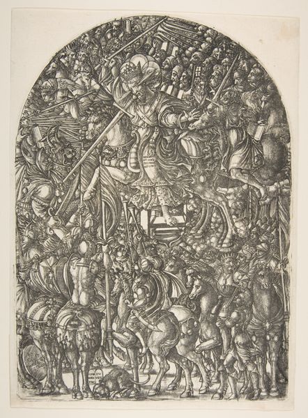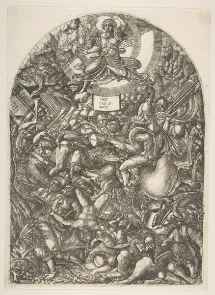 Curator: Look at this print! Jean Duvet’s "Saint John sees the Four Horsemen, from the Apocalypse," created sometime between 1480 and 1570. It’s quite striking. Editor: Indeed, a real visual bombardment. So much is going on! My first impression is a sense of utter chaos, everything seems to tumble down towards us. Curator: That's interesting. Given Duvet's influences from the Northern Renaissance, his approach to line and density speaks to a tradition deeply invested in surface and texture. It is an engraving printed with ink; the labor invested in those swirling marks... Remarkable! Editor: Absolutely! It is as much a reflection of the social and religious anxieties of its time, isn't it? The apocalyptic imagery connects directly to political unrest, and perhaps also to a certain level of fear in the wake of social changes. Curator: One must consider, too, the conditions under which Duvet, a goldsmith by training, accessed engraving as a means of expanding production. Think about the guilds, and systems that influenced who had access to printmaking, the types of ink being manufactured at the time. Editor: All incredibly valid material considerations! For a contemporary viewer, how do we process these densely layered bodies tumbling before the divine’s judgment? I am reminded that artistic renderings such as these held public roles far beyond aesthetics—shaping public beliefs and providing cautionary symbols that extended to political behaviour. Curator: Well, from a material standpoint, that widespread influence came from print's relative reproducibility compared to other mediums! Each impression disseminated not just an image, but ideas dependent on production and labor. Editor: I wonder about this piece's role during the Reformation. Considering iconoclasm, the use of strong visuals takes a complex, even dangerous turn as imagery becomes centrally important. Curator: In summary, it demonstrates engraving's fascinating intersections—spiritual representation filtered through human material transformation. Editor: Yes, leaving us to contemplate how artistry like Duvet’s reflected, and perhaps even fueled, cultural discourse of its tumultuous age.