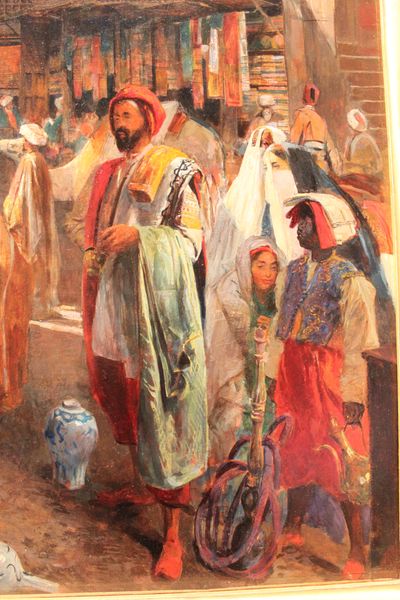Editor: Here we have Delacroix’s painting, "Moroccan Chieftain", crafted with oil paint. There's something really captivating in the figure's posture, yet the background seems vague, dreamlike almost. How do you interpret the composition here? Curator: Focusing on form, notice the interplay between the crisp, almost sculptural treatment of the chieftain and the blurriness of the landscape. Delacroix is exploring contrasting textures through his brushwork; the way light reflects off the chieftain's garments. What do you think the artist intends by doing this? Editor: Maybe to focus solely on the individual while somewhat isolating him from context? Curator: Precisely! He accentuates the Chieftain using vibrant pigments, while he employs earth tones and diffused strokes in the surroundings, further distancing our subject from the setting. It directs the viewer’s attention to the figure himself. Notice, also, how he repeats the red color; it seems to me he attempts to highlight important characters by drawing focus to them with distinct colors and lighting. Editor: That makes sense. So, would you say the strength of this painting relies mainly on its compositional balance and handling of color and form? Curator: Absolutely. Delacroix manipulates our gaze through considered brushwork and colour contrast. Editor: I never would have noticed all of that by myself. Thanks for pointing out such specific choices. Curator: My pleasure!