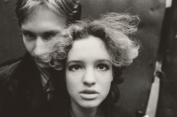 Curator: This gelatin silver print, "Italy, May 1977 - August 1978," was produced by Francesca Woodman during her time in Italy. The scale is quite intimate, just 143 by 158 millimeters. Editor: The contrast is striking—a man in a tank top, half his face in shadow, standing next to a woman with haunting eyes. It feels heavy with unspoken narrative. Curator: Woodman’s process involved a lot of experimentation with darkroom techniques, often using herself as the subject. Think about her social context; she was a young woman grappling with representation and self-image. Editor: True, and the way the light falls, creating stark divisions, speaks volumes about the push and pull within relationships, or perhaps within one's own identity. The materiality of the photograph itself—the grain, the tonality—adds to this effect. Curator: Exactly. Considering the limitations of analogue photography at the time, the labor involved in creating these images was significant, a deliberate act against the grain of disposable image culture. Editor: Yes, it's a powerful, carefully constructed image that resonates far beyond its simple composition. Curator: It really makes you consider the circumstances under which she was working. Editor: Indeed, this has been a fascinating closer look.