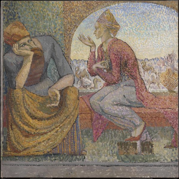 Editor: This is a study for a mural in a lunette, part of Charles Sprague Pearce's "Family and Education" series, created around 1896. The mural itself is located in the Library of Congress. I'm immediately struck by how serene it is, this classical landscape setting, these two women engrossed in study. What catches your eye? Curator: The light, the tender light. Notice how it drapes itself across the figures, making them both present and otherworldly? It whispers to me of idealized learning, not the frantic cramming we know today, but something more…contemplative, perhaps even sacred. It reminds me of summers spent lost in books, under the forgiving gaze of ancient trees. Does it evoke something similar for you? Editor: Definitely a feeling of timelessness. The setting seems deliberately vague, almost mythical, with that classicizing architectural detail above the painting, while the figures, although in classical robes, feel somehow modern in their engagement. I'm curious, what do you make of their interaction, of the tools, like the compass, spread before them? Curator: Ah, the compass! Pearce uses symbols like this, and the books and scrolls, to represent learning as an active, engaged process. These aren't passive muses; they are women *doing*, women *creating*. And the fact that it is for the Library of Congress connects it to the architecture itself. I see it as an early attempt to claim a space for women in a public, intellectual life. Think about the date too - the late 1890s, just before the turn of the century! What does that evoke for you? Editor: So the mural’s not just decorative, it is making a statement? A pretty radical statement, now that I think about it, showing intellectual women placed in the heart of one of the nation's greatest symbols of knowledge! Curator: Exactly! And it invites us to think about *who* is welcomed into the hallowed halls of knowledge, then and now. Art has that amazing capability: to open those avenues. Editor: Wow, I'll never look at this mural the same way again. Thanks for highlighting aspects that I never would've caught!