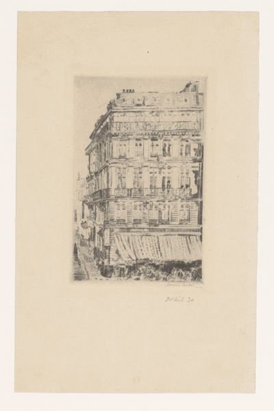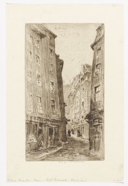 Curator: Alexander Schaepkens' etching and print, “Kersenmarkt te Maastricht,” made sometime between 1830 and 1899, invites us to consider a past cityscape held within the Rijksmuseum collection. What strikes you first about it? Editor: Its austerity. Stark, almost haunted. The scene feels sparsely populated, almost deserted, save for those few figures swallowed by the imposing architecture. It is strangely melancholy. Curator: That feeling resonates, considering etchings were often vehicles for both documentation and imaginative rendering. What architectural motifs do you recognize? Editor: I'm drawn to that off-kilter building on the left. The artist makes sure it almost touches us, the viewers. It has a haphazard, lived-in feeling, which lends it character. And the looming spire in the distance anchors the scene, reminding us this is more than just a street. There’s history layered in every line, it feels like. Curator: Observe the linework: chaotic in shadows, sparse in light. How might this artistic decision amplify a viewer's perception? Editor: Absolutely! It captures the inherent transience of city life. Etchings and prints feel appropriate, a means to replicate memory. Even its supposed realism evokes a dream. A reconstruction of something the artist loved and needed to remember. I imagine walking there. It is an intimate moment. Curator: It’s an invitation to step into a tangible past. Thank you for articulating this sentiment so well, lending a new perspective to the symbolic depth within this seemingly straightforward cityscape. Editor: Thanks, that's the goal, isn't it? Hopefully it evokes memories in the visitor, or kindles curiosity about Maastricht's historical tapestry.