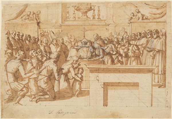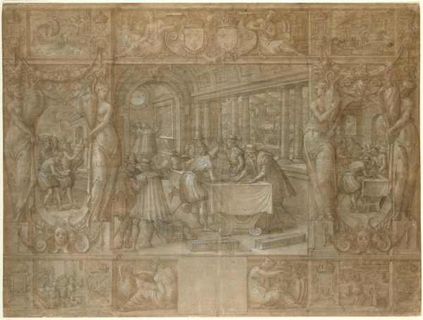 Curator: Welcome. Before us is "The Coronation of Esther," a drawing attributed to Carlo Urbino, created sometime between 1510 and 1585. It's currently held at the Metropolitan Museum of Art. Editor: The first thing that strikes me is how it looks unfinished, yet it exudes power. It’s all line work, seemingly minimal material intervention, but grand in scale. The stagecraft is immense, the production values feel rich even in a monochrome rendering. Curator: Indeed. As a Renaissance-era depiction, this drawing speaks volumes about the representation of power and virtue through its historical context, particularly for the Church's theater, highlighting the theatrical element inherent in religious art. Consider, too, its place within the larger narrative of religious authority in that era. Editor: And consider the material simplicity achieving this. A red chalk drawing; the accessibility of this medium implies it was easily distributed among many people for use or reuse. A way to disseminate ideals and influence. Curator: Precisely. The ease of reproduction suggests this wasn’t just about the final artistic object but its impact on societal norms, religious and political theatre of the period. The distribution mirrors power structures. Who got to see it? Who commissioned it? Editor: Let's talk more about process. The perspective lines still visible show the craft clearly and indicate the importance of mathematics. These linear projections become literally, visibly, integral to the performance of the drawing's symbolic weight. The precision echoes authority. Curator: Agreed. It emphasizes the structured and calculated approach to not only art creation but also social engineering in Early Modern Europe, and is an excellent case for looking into scenography and set designs in Europe. Editor: Absolutely. Seeing the raw bones of artistic construction lets us appreciate the materiality informing the spectacle; from pigment to political agenda, no? The social context, indeed! Curator: Yes, examining such artwork illuminates not just artistic skill, but how art serves ideological functions within society. Editor: Well put, I think that really gives us some perspective on materiality. It can lead us toward understanding influence and ambition.