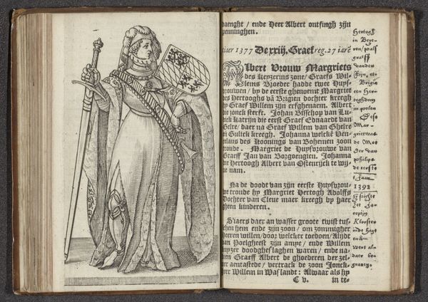 Editor: This engraving, "Margaretha van Beieren," made by Hendrick Goltzius around 1586 or 1587, strikes me with its intricate detail, particularly in the queen’s garments and crown. How do you read this piece as a formalist? Curator: I appreciate your observation. Formally, consider how Goltzius employs line and texture. The engraving technique allows for remarkable precision in depicting fabric and jewelry. Look closely: the textures created through the use of varying line weights and cross-hatching contribute significantly to the illusion of depth and volume. The symmetry in the composition and her vertical pose create balance, what could this imply in Northern Renaissance prints? Editor: I see what you mean about the use of line. But, beyond that, I'm not quite sure I can appreciate it formally. Does the symbolism of her stance influence our interpretation? Curator: The question should be: how do the visual elements themselves create symbolic meaning? Her upright stance and direct gaze contribute to a sense of authority. The relationship between form and content are symbiotic, though they are not necessarily connected. Is the scale, format, and execution connected in some way to meaning in the image, and the image to its function as illustration to text on the right? Editor: I never thought about it that way! Focusing solely on the formal elements gives a completely new meaning. Now the texture, symmetry and pose suddenly underscore a powerful and composed authority that could be missed otherwise. Thanks. Curator: Absolutely. And it is an effect of a unique approach to the work itself!
