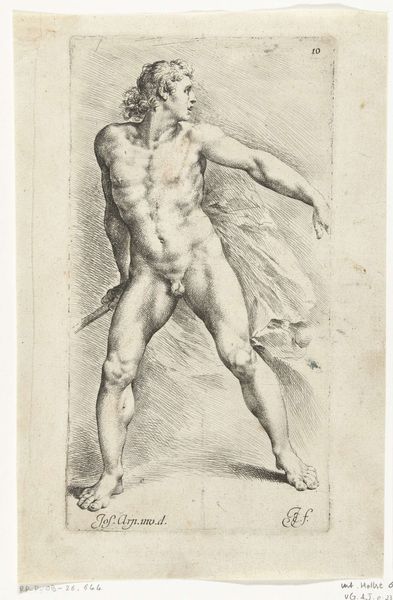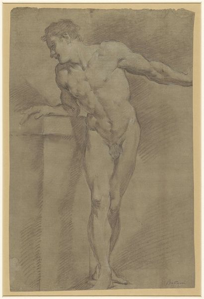 Curator: This drawing, dating from 1703-1775, and held here at the Rijksmuseum, is titled "Mannelijk naakt, staand, op de rug gezien," or "Male Nude, Standing, Seen from the Back," and is attributed to Louis Fabritius Dubourg. It's rendered in pencil. Editor: It strikes me immediately how the red chalk emphasizes the raw physicality, almost like a blueprint for labor. The hatch marks surrounding him amplify the robust three-dimensionality. Curator: Absolutely. You see the clear influence of the academy here, especially in its depiction of idealized male form. It's quite characteristic of the period, meant for the education of artists. These were displayed within studio walls as models. Editor: And what's interesting is that this "educational" process is also embedded in a particular social context, training artists who likely served powerful patrons, creating artworks which were luxury items. Curator: Yes, art patronage shaped so much of artistic production at the time. The demand for academic drawings, the network between students, artists, and their relationship to societal forces contributed to a standardized visual culture that trickled down from elite to popular imagery. Editor: The texture of the paper, the pressure applied to the pencil—these all point to a craftsman dedicating labor to constructing an ideal form. The choice of such intense chalk isn't just aesthetic either; I wonder how the availability of this reddish pigment played into popularizing drawings of its kind. Curator: A wonderful point! I hadn't considered that specific element of availability shaping aesthetic trends. This does broaden the narrative we assign to the piece. Thank you! Editor: Likewise! I now consider the work as something much more than simple craftwork; instead I view it as something produced and propelled by specific socio-historical structures. Curator: Agreed. It allows a richer and fuller appreciation of how art functions and affects the development of public tastes during its period and today.