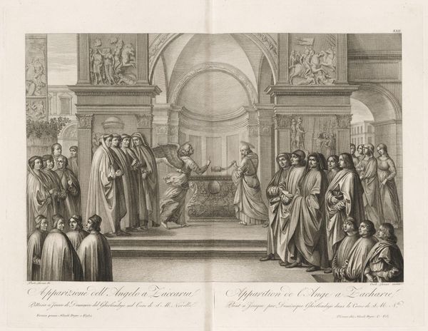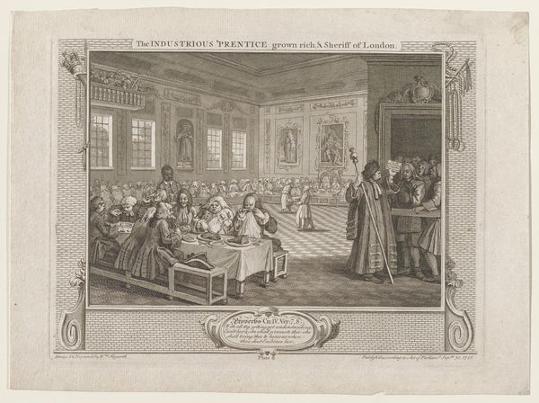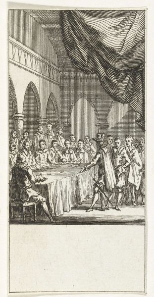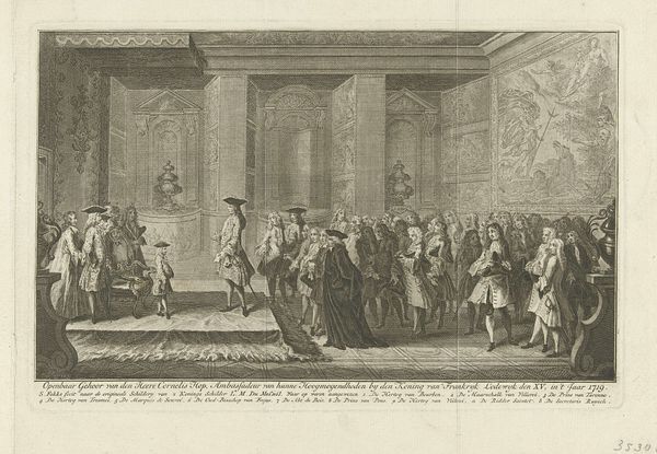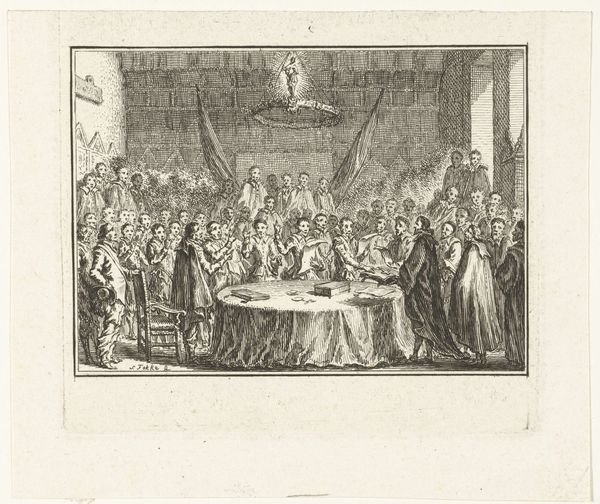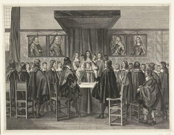 Curator: Before us we have Bernard Picart's engraving from 1728, depicting "Willem III wordt ingezworen als stadhouder, 1672," housed right here at the Rijksmuseum. Editor: The scene is crowded but incredibly still. A somber palette dominates, emphasizing the weight of the moment—something ceremonial, official, almost suffocatingly so. All eyes converge on the central figure. Curator: Indeed. The work showcases William III being sworn in as Stadtholder, and what interests me most are the ancestral portraits overlooking the scene. They are carefully arranged to convey lineage and historical legitimacy. A visual testament to power, don’t you think? Editor: Absolutely, but whose power are we truly witnessing? There’s a certain… unease. A tension between individual agency and prescribed destiny. I see a constructed narrative of leadership designed to exclude anyone from dissenting. A story that only centers a powerful, select group. Curator: Don’t overlook the importance of these symbolic displays. It wasn’t merely about power in the political sense, but more significantly about the image and ensuring continuity—solidifying their place in the collective memory. Editor: I understand the symbolic importance. The artist constructs meaning through rigid adherence to expectations—formal dress, unwavering gazes. But this carefully constructed tableau is ripe for subversion. Whose stories are silenced by this singular depiction of authority? Curator: Perhaps. But even the choice of engraving—the crisp lines, the replication of imagery, allowing a wider public to see and disseminate the narrative—that carries power in itself. These are images carefully crafted to be remembered and reproduced, reinforcing legacy. Editor: An actively reinforced legacy built atop societal systems. A reproduction doesn’t equate democratization. The people might witness it, but that doesn't give them any real stake. This image is a mirror for the powerful, not a window for the powerless. Curator: Maybe the true legacy resides in our persistent revisiting, challenging and reinterpreting those initial narratives across time. We are, in some ways, performing our own swearing in ceremony as we continue our exploration. Editor: Precisely, recognizing these representations within history, but always questioning whom they genuinely represent, and perhaps more critically, whom they implicitly omit.