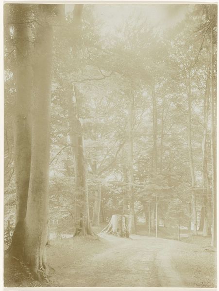 This is a photograph entitled "Forest Scene" by Constant Alexandre Famin. The photograph is characterized by the stark contrast between light and shadow. Dominating the composition are the towering trees which draw our eyes upward, creating a sense of vertigo as the canopy meets the sky. Note the semiotic weight of the single figure positioned on the forest path; the figure invites us to consider the themes of scale and the individual's place within nature. The use of sepia tones flattens the image; it invites us to reflect on the artistic conventions of landscape photography during this period. Consider how this limited tonal range and the deliberate arrangement of the trees serve not merely to represent a forest, but to construct an idealized vision of nature. Ultimately, "Forest Scene" speaks to the complex interplay between representation and reality. It reminds us that even in the most seemingly straightforward depictions, art is always mediated through the lens of cultural and aesthetic conventions.