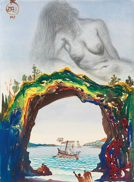 Editor: So, this is Salvador Dalí's "Adolescence" from 1941. It's watercolor, and the colors are so muted. It gives the scene a feeling of…resignation almost. Two figures sit by a misty seascape, and there’s something haunting about their stillness. What do you see in this piece? Curator: It's interesting that you pick up on the feeling of resignation. Dalí painted this during a period of intense personal and global upheaval, the height of World War II, living in exile in the United States. Can you consider how the figure on the left perhaps embodies traditional notions of femininity in contrast to the figure on the right? Do you see them as gendered forms? Editor: The one on the left definitely reads as traditionally feminine, the robes almost motherly. The smaller one... ambiguous? Is that intentional, this lack of definition? Curator: Absolutely intentional. This ambiguity speaks to Dalí's complex understanding of adolescence as a liminal state, a period of becoming, caught between established gender norms. The vagueness might invite viewers to see a queer potential that challenges accepted definitions of identity. It seems relevant when exploring themes like family and the safety that might or might not represent during those years. Editor: That makes sense. Seeing the figures as symbols rather than literal people opens up so many more layers. What a clever technique. Curator: Dalí constantly challenged conventional understandings, and placing gender and identity within his landscape demonstrates a powerful visual statement about challenging established order and societal expectations. How does the landscape contribute to the interpretation? Editor: I guess the misty vagueness of the scene mirrors that liminal state, this not knowing, that you describe, both about who you are and your place in the world. Curator: Exactly! So by blending his personal experiences with broad cultural issues, Dalí encouraged engagement with concepts that extend beyond art into broader issues. Editor: That's such a richer context than I would have reached on my own. Thanks! Curator: My pleasure! There’s always something more to discover beneath the surface, isn't there?