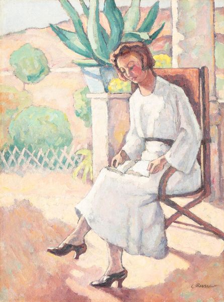 Editor: So, here we have Zinaida Serebriakova's "Portrait of E.I. Finogenova" from 1920, beautifully rendered with watercolor and possibly oil, it looks like. There's this serene, almost melancholic quality to her gaze, and a softness about the whole composition... what catches your eye? Curator: Ah, yes, Finogenova. Doesn’t she remind you of a pre-Raphaelite muse, transported to the stark realities of post-revolutionary Russia? Serebriakova painted this during a period of immense hardship, yet the painting whispers of intimacy and a quiet inner life. I'm struck by the cool palette, almost monastic, which somehow amplifies the warmth in her auburn hair. Have you noticed how the loose brushstrokes create this feeling of movement, of fleeting time? It’s a fragile beauty, don't you think? Editor: Absolutely. That fragility is palpable, especially given the historical context. It’s like Serebriakova is trying to preserve a sense of grace amid chaos. The lighting is incredible as well, really brings forward her complexion. Curator: Precisely. She captured that inner luminosity… almost as if painting the soul itself, right? And think about the power of that gaze. Where do you think she's looking? What’s she seeing? I find that question pulls me deeper and deeper into the painting. It invites speculation! Editor: A bit of hope maybe? A future beyond what's visible? I’m struck by how modern it feels, even though it's a hundred years old. Curator: Modern indeed! And to think, Serebriakova was often sidelined simply as a ‘portraitist.’ To me, that is a dismissal, or a terrible waste. With works like these, she wasn’t just painting faces; she was charting emotional landscapes, echoing the spirit of an era on the precipice of monumental change. What a witness. What an artist! Editor: It’s like the painting breathes with its own silent stories. Now I'm finding a wealth of personal experience behind her intimate style! Thank you so much for pointing that out. Curator: My pleasure entirely! Perhaps all art does, really, is offer a fleeting glance at the world through another’s eyes. A borrowed vision.