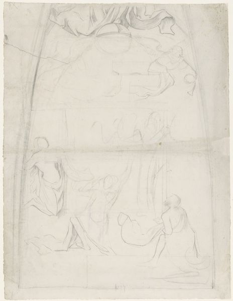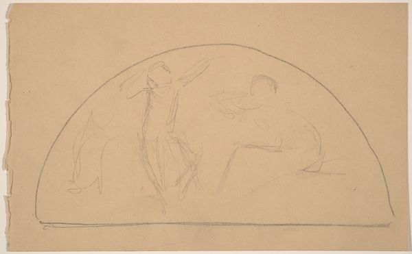 Here is a drawing of "Putti aan weerszijden van een medaillon" made by Dionys van Nijmegen. The sketch presents a central medallion flanked by putti, rendered with delicate lines in what appears to be red chalk on paper. The composition is sparse, focusing on the interplay between the figures and the circular form. Nijmegen uses line work to create volume and suggest movement. Notice how the contours of the putti are implied rather than explicitly defined. This technique opens up a semiotic space for the viewer to participate in completing the image. The drawing, while classical in subject matter, verges on abstraction through its reduction of form and emphasis on line. It destabilizes the clear boundaries between representation and pure form. The drawing underscores how traditional subjects could be a site for formal experimentation. This approach would resonate with later movements that sought to challenge fixed meanings through abstraction.