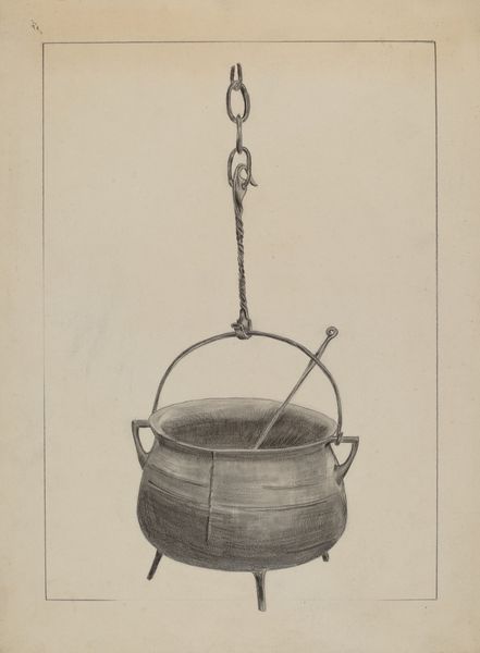 Curator: Before us, we have a drawing entitled "Duncan Phyfe Sewing Cabinet," crafted around 1936. The artist, Mattie P. Goodman, used pencil and graphite on paper. Editor: Immediately striking is the sheer verticality emphasized by those repetitive lines. The composition almost creates a visual hum. Curator: The drawing style aligns with decorative arts traditions, wouldn’t you say? Notice the precision in depicting the cabinet’s geometry—the ovoid top, the fluted cylindrical body. Editor: Of course, and Goodman’s choice of subject evokes a very specific demographic of the era, reflecting an intimate scene of domesticity. It also raises questions of authorship—who gets to be an artist, and whose stories are preserved. Women's creative labor, so often overlooked. Curator: Yes, but the focus here, I think, is on the construction itself. Observe the careful rendering of light and shadow. This is a celebration of form, showcasing the elegance and symmetry inherent in Phyfe's designs. We should recognize Goodman’s command over line work and shading. Editor: But doesn't this detailed depiction almost elevate the status of these items, while simultaneously distancing it from its original utility? Curator: I agree to an extent; however, I see the artwork’s aesthetic function in offering insights into historical designs and craftsmanship. It acts as a document, carefully articulating Phyfe’s stylistic principles. Editor: Fair point. Goodman uses artmaking to explore gender roles but simultaneously replicates conventional, structured designs and spaces in which such things are located. This sewing cabinet reflects the intersection of social roles, aesthetics, labor and art, each one existing inside one another, literally built into the others. Curator: It truly is a visually fascinating object that also manages to pose interesting theoretical and historical issues. Thank you for drawing that to my attention. Editor: Always. Thank you, for taking the time to engage with this work.