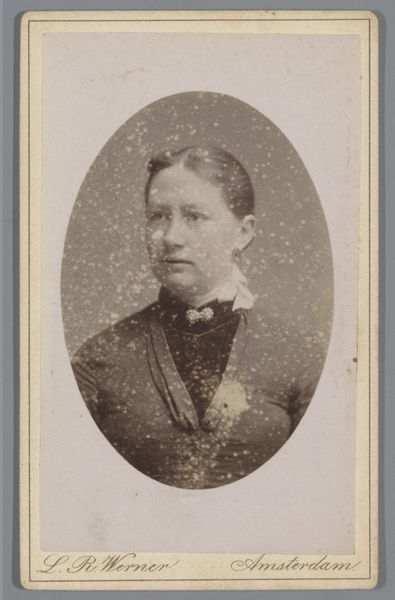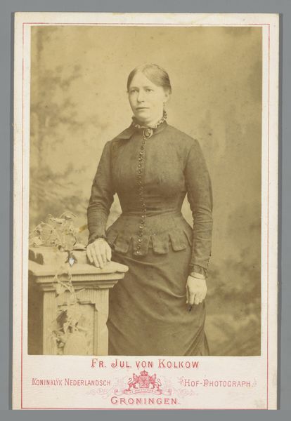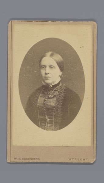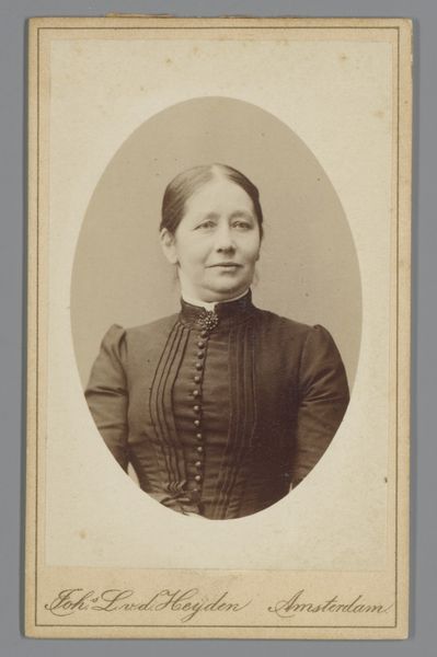 Editor: This is "Portrait of Russia Agatha Dijkshoorn," a albumen print photograph taken sometime between 1880 and 1883 by Jan Goedeljee. I'm struck by the formality of the portrait, but also the way the subject's dress almost obscures her figure. What are your thoughts about this piece? Curator: As a materialist, my interest is piqued by the albumen print itself. Consider the process: egg whites coating paper, reacting to light. Photography was already impacting portrait painting, creating more affordable options. The lace adorning her dress and high collar speaks volumes about the meticulous labor involved in creating and maintaining fashionable garments of the time. Think of the class structures embedded in those acts of creation and consumption. How does understanding this inform your reading of the portrait? Editor: I guess I hadn't thought of the actual labor involved. It feels so separate from the image itself, but those clothes didn't appear out of thin air. How accessible would this type of photography have been? Curator: Initially, it was more accessible to the middle class, but became widespread with technical improvements in the following decades. Goedeljee even imprinted their name, advertising their services to further feed a demand. This wasn't just about art, it was also about the burgeoning commodification of self-image, a nascent industry. Editor: It's interesting to consider how much labor and production is involved in this 'simple' photograph. It gives me a new appreciation for the social and material context of art. Curator: Precisely! Analyzing these images through materiality reminds us to ask not just *what* is represented, but *how* it was made, by whom, and for whom.