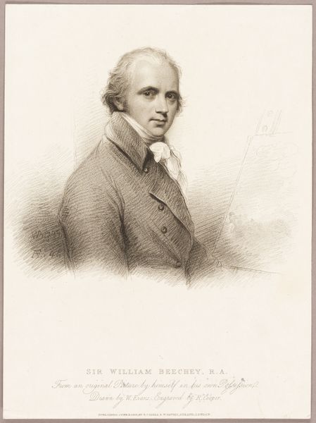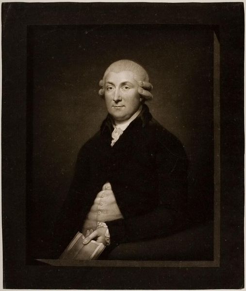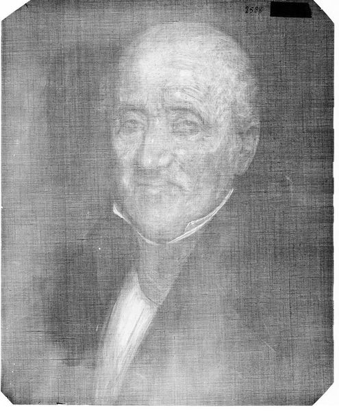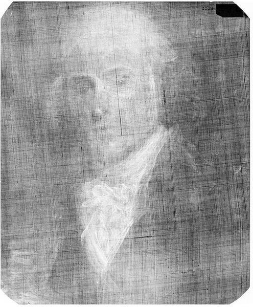 Editor: This is an X-radiograph of "Sir Uvedale Price," by Thomas Lawrence. It's fascinating to see the layers beneath the surface. What strikes you about the composition of this piece? Curator: The X-radiograph reveals a hidden structure. Notice the density of the paint application, creating distinct areas of light and shadow. The linear patterns suggest a calculated method of layering. Editor: It's almost like seeing the artist's thought process. Are there any unexpected formal elements revealed by the X-ray? Curator: The radiographic image, in its monochrome palette, simplifies the tonal relationships. This underscores the importance of value in the original portrait's illusion of form and depth. Do you find it affects your interpretation? Editor: Absolutely. It shifts the focus from the subject to the artist's technique. Curator: Precisely. This work encourages us to consider how the artist constructs their image, revealing the materiality behind the representation. Editor: I never thought about a portrait this way. Thanks! Curator: You're welcome. It's about looking beyond the surface.