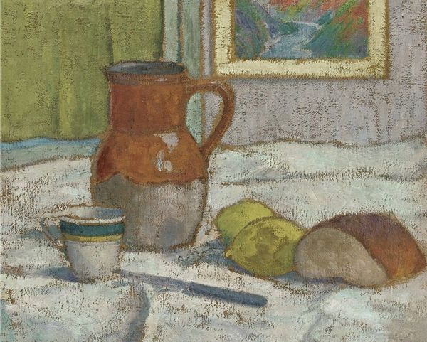 Édouard Vuillard created "Two Women Drinking Coffee" using oil on cardboard. The composition is immediately striking with its dense arrangement of forms and muted palette. The eye struggles to find a focal point, drawn instead into a web of interconnected shapes and textures. Vuillard's radical approach to perspective collapses the foreground and background, creating a flattened pictorial space. The figures blend almost seamlessly into the domestic interior, challenging traditional notions of representation. It evokes a sense of intimacy and quiet contemplation. The painting destabilizes conventional distinctions between figure and ground, interior and exterior, representation and abstraction. The semiotic system of signs is disrupted through the subversion of traditional artistic conventions. The dissolution of form suggests a critique of fixed meanings and categories. Vuillard's work invites ongoing interpretation and challenges us to reconsider the boundaries of art itself.