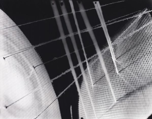 Curator: Let’s turn our attention to this fascinating monochrome photograph. The piece is titled "Untitled, String and Light Box" by Nathan Lerner, date unknown. What’s your initial reaction to this piece? Editor: Intriguing, isn't it? At first glance, it feels like looking into a strange, inverted world. The high contrast is so striking; the harsh lights and dark shadows almost make it feel like a film noir scene contained within a small frame. Curator: Well, when looking closely at the processes of image construction, we see it plays on light and shadow but not necessarily in any film sense. Instead, consider the simple arrangement: string tautly arranged across some form of frame and, based on the title, likely illuminated from within. It's the interplay between light and shadow, the rigid material of string, the textile grid, the box construction that I find compelling. This isn't some grand narrative, just humble objects, isn't it? Editor: Humble, but intensely evocative! I can’t help but see vulnerability in the delicate threads, pulled taught as if any moment they might snap. It makes you ponder those unseen forces which pull us one way or another. Maybe this piece does engage a grander narrative, though an abstracted one, of constraints or possibilities! Curator: And is the photograph itself, the printing process, another material intervention that should be pondered. After all, the abstract expressionist movement really exploded, in part, because of materials being much more readily available. We have, on the one hand, materials within the image and on the other hand, the materials of the photo as its own intervention. I suspect Lerner considered them one in the same. Editor: Perhaps. I see in this work a compelling juxtaposition between constraint and freedom. It’s the tension in those lines that really speaks. And like, you mention, perhaps these materials can and should be read into that expression. You start pondering that relationship, and there's so much to explore about balance and impermanence. Curator: Ultimately it suggests something about the making of an image itself: the framework upon which reality is built. Editor: Indeed, something fundamental about how we perceive and construct our realities. Makes you want to pick up a camera or a thread yourself!