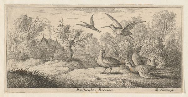 Editor: Here we have "Querquedula, Cercelle," or "The Teal," from Albert Flamen's "Book of Birds," dating back to the mid-17th century. It's an etching – delicate lines bringing a flock of teal to life. What strikes me is the sense of serene observation, almost like peering into a secret world. What do you make of it? Curator: It whispers stories, doesn't it? Flamen wasn’t just drawing birds; he was capturing a feeling. It reminds me of being a child, utterly absorbed by the minute dramas in my backyard. It's an echo of the Dutch Golden Age, where close observation of the natural world was almost a spiritual exercise. Do you notice how he's framed the birds against this sprawling landscape, this tiny drama against the world. Editor: Absolutely! There's that little Dutch village nestled in the background, almost a world away from the ducks' concerns. Curator: Right! It’s about scale, about humans and nature, interconnected yet separate. Think of the philosophical debates happening at the time, this explosion of scientific curiosity... It's all swirling in there, wouldn’t you agree? It's not just ornithology; it’s about existence, about where we stand in the grand scheme. Does that resonate with you? Editor: It really does! The scientific observation mixed with the broader philosophical context...it reframes how I see these "simple" nature scenes. Thanks! Curator: My pleasure! Sometimes, the most profound insights are found in the smallest details. A reminder to always look closely.