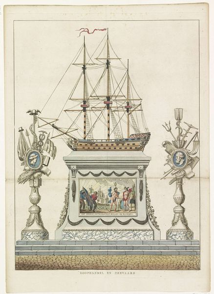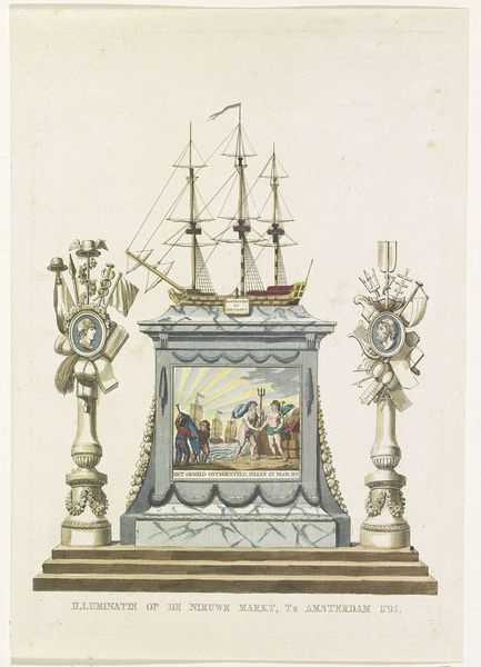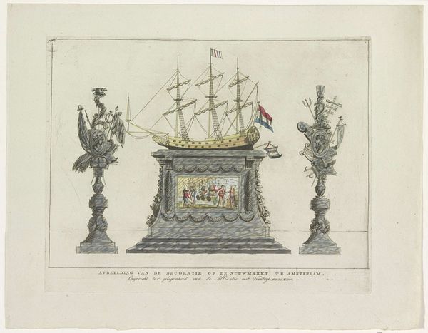 A. Verkerk made this print of a decoration in the Nieuwmarkt in 1795. It was made using an etching technique, a printmaking method in which lines are incised into a metal plate with acid. The fine lines of the print allow for intricate details, seen especially in the depiction of the ship, allegorical decorations, and the architecture of the square. The etched lines create a sense of depth and texture, which gives volume to the image and emphasizes the monument's presence in the public square. The print refers to the Dutch Republic's maritime power and commercial prowess, with the ship symbolizing trade and exploration. As such, the print suggests an association between artistic creation, historical commemoration, and the economic activities that shaped the Netherlands during the 18th century. This association reveals how deeply enmeshed the world of art was with maritime trade.