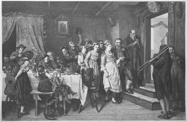 Gustave Doré created this illustration of Don Quixote using detailed line work to bring the scene to life. Notice the composition: Doré uses hatching and varied line weights to create depth, guiding our eyes to the subjects in a carefully constructed interior. The density of lines creates texture and shadow, conveying not just forms but also atmosphere. Look at how the artist contrasts the light and dark areas to define the characters and their surroundings. The composition is dynamic, filled with figures engaged in various activities that add a sense of bustling energy. Doré’s technique invites us to consider how such visual elements function as a narrative device. The detailed rendering of the scene and its inhabitants encourages a deeper reading of the narrative themes, mirroring the complexities within Cervantes’ novel. The graphic style and arrangement of elements serve to highlight the story's interplay between reality and illusion.