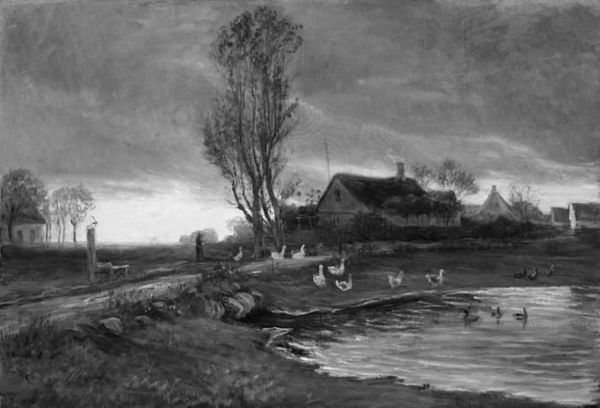 Peter Rostrup Bøyesen made this landscape painting, ‘Gathering Thunderstorm, Gilleleje’, with oil on canvas. The rough handling of the paint is notable; Bøyesen has applied it wet-on-wet with a fully loaded brush, meaning that the strokes are thick and textural, and not blended. The result is a vigorous image, charged with its own internal energy, mirroring that of the storm. The visible brushwork reminds us that painting is fundamentally a physical process, involving not only the application of skill, but also brute labor. The composition might be described as ‘alla prima’, a direct, immediate approach. This places it in stark contrast to the traditional methods of art academies, which prioritize slow, controlled, and idealized representation. Instead, Bøyesen chose to honor the expressive potential of his materials. Ultimately, this painting asks us to reconsider the usual hierarchies between concept and execution, and to appreciate the making of an artwork as an important part of its meaning.