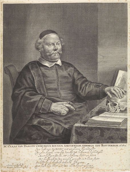 Curator: Welcome. We’re standing before Crispijn van de Passe the Younger's engraving, "Portrait of Elias Taddel," created in 1654. Editor: A severe, yet intimate depiction. The monochrome printmaking lends a timeless solemnity. It reminds me of the weight of tradition, of old knowledge. Curator: Precisely. The meticulous engraving highlights van de Passe’s mastery. Notice the fine lines that define Taddel’s face and the textures of his garments. The interplay of light and shadow creates a sense of depth, typical of Baroque portraiture. The composition employs carefully constructed visual rhetoric and offers many intriguing intellectual features. Editor: And the trappings of academia and religion, a clear display of the sitter's authority. That hourglass, though...isn’t that an overt symbol of mortality? It underscores how knowledge is pursued under the shadow of our own temporal existence and finitude. Curator: Indeed. But within that limitation, he becomes, by divine ordination, one empowered by the Truth. Note how Taddel’s gaze meets ours directly, engaging us and demanding attention and respect for his knowledge. Editor: He looks like someone who has been around the block once or twice, no doubt. Is he actively inviting us to grapple with our notions of faith and the systems constructed to convey such traditions? I read this not as an image of power but also of responsibility—we are implicated within this web, responsible to continue in pursuit of the truths found among and between such structures, like the massive book at his side. The academy has power precisely because others seek to engage with it, to lend their effort to that legacy. Curator: A fascinating take on what the artist is saying here. He seems to emphasize both authority *and* the constraints of temporality as they impact us. I hadn't really put the accent on the weight of such institutions. Editor: The brilliance of art. There's something for each to encounter that is unique and moving. Thank you for illuminating the historical nuances in Passe’s technique and Baroque conventions! Curator: And thank you for sharing your perspective on how Taddel invites us to be critical participants of history.
