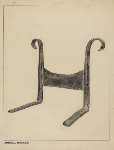 Editor: Here we have Eugene Bartz's "Clamp Jack," painted around 1937 using watercolor and drawing. The depiction of this wooden tool, this object of labor, has a strangely monumental feel. What strikes you about it? Curator: It’s fascinating how Bartz elevates this utilitarian object. What we see is not just a clamp jack, but an index of labor. The tool itself becomes a record of use, a testament to the act of making and its place in the American economy. How does its depiction, specifically rendered through drawing and watercolor, complicate the value typically assigned to fine art versus craft? Editor: I see what you mean. The choice of watercolor, often considered a delicate medium, feels like an interesting contrast to the sturdy, practical nature of the clamp jack. Does that medium itself imply any intended reevaluation of manual labor? Curator: Absolutely! By employing a medium like watercolor, which historically might have been relegated to preliminary sketches or "lesser" artistic endeavors, Bartz interrogates the established hierarchy between art and craft. This tool is usually hidden, backstage so to speak. Presenting it in such a delicate manner encourages the viewer to confront the process of its creation and how that process translates to economic value during the 1930s. Think about it as an attempt to visually challenge how things are made, consumed, and valued during this period. Editor: So it's almost a commentary on the dignity of labor through the very materials used to depict it. Thanks, that’s really insightful! Curator: Indeed, we come to appreciate the object in a completely new light through Bartz’s lens. It’s a poignant statement on how labor, materiality, and art intersect, challenging established norms and prompting further reflection.