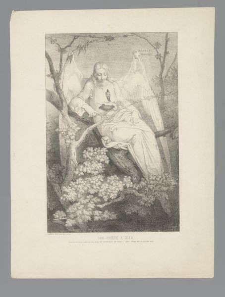 Adolphe Mouilleron created this print, "Old Man Entertaining a Young Girl in the Woods with Wickerwork of Branches", sometime in the mid-19th century. We see an old man weaving a wreath from twigs for a young girl in a forest setting. The wreath, a circular form of interwoven flora, has roots stretching back to ancient rituals, symbolizing cycles of life and death. Consider its earlier pagan associations with nature and divinity, reborn in Christian iconography as a symbol of triumph and eternity. A similar motif appears in Botticelli’s “Primavera” where Flora scatters blossoms, linking the wreath to renewal and the continuity of life. The act of weaving itself speaks to connection and creation. It's a poignant reminder of how symbols evolve, adapting to new cultural landscapes while retaining echoes of their primal origins, engaging our subconscious with their profound emotional resonance. The wreath, therefore, is not merely a decoration, but a potent emblem, its cyclical form embodying the endless dance of human experience and the enduring power of cultural memory.