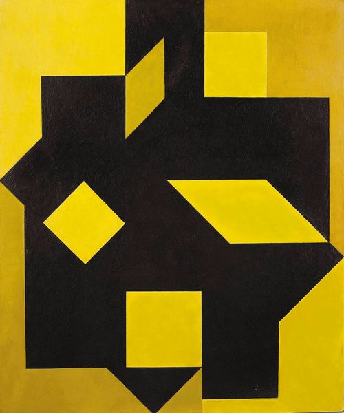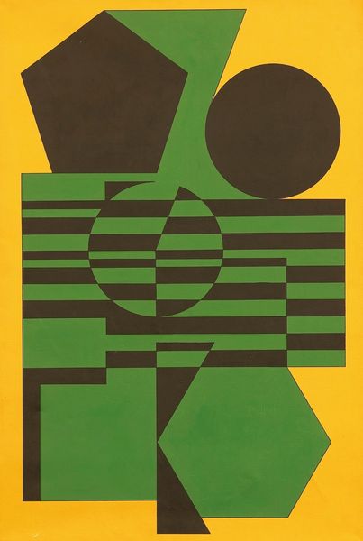 Editor: This is Victor Vasarely's "Rochero," created between 1987 and 1988. It’s a striking composition of geometric forms in shades of green and black against a yellow backdrop. It reminds me a bit of Op Art but…chunkier? I’m curious about what underlies this work – what do you see here? Curator: Well, focusing on its materiality, it's crucial to consider the historical context of mass production that deeply influenced Vasarely. This piece, “Rochero,” exemplifies his exploration of geometric abstraction, moving art beyond the confines of unique craftsmanship and exploring modularity as a process in its production. Editor: Modularity, as in, these shapes are meant to be repeated? Curator: Precisely. Consider the socioeconomic factors, too: Vasarely sought to democratize art through these replicable forms, envisioning a society where art wasn't a privileged commodity, but accessible and integrated into the built environment. Editor: So, even though it’s a unique artwork in a museum, it still speaks to ideas about art for the masses? The choice of basic geometric forms makes more sense now. Curator: Exactly! This aligns with post-war ideals of functionality and accessibility which re-evaluated the division between "high" art and industrial design. Does analyzing Vasarely's production process challenge the traditional view of the artist as a singular genius? Editor: Definitely! It shifts the focus from the artist’s hand to the broader systems of design and manufacture. It almost anticipates digital art in a way. I appreciate that new perspective. Curator: Likewise, thinking about how art is not just an object but a process embedded in socio-economic realities deepens our understanding.