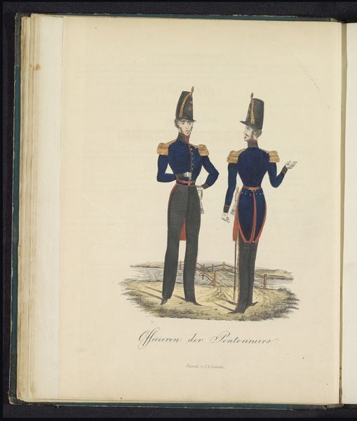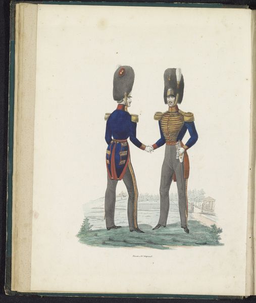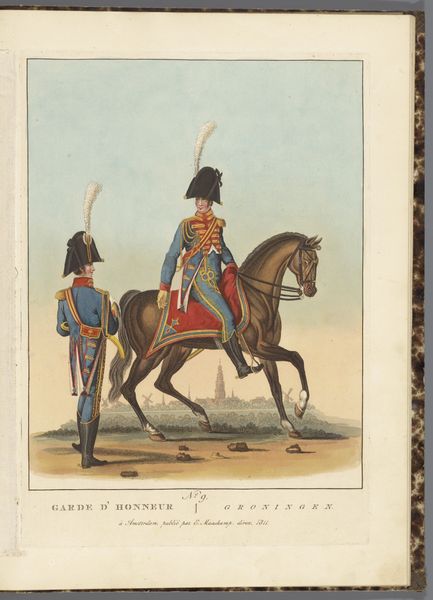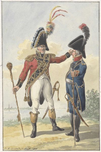 Editor: Here we have "Erewacht te Delft, 1811," a watercolor drawing now at the Rijksmuseum. It depicts two guards in uniform. The crisp lines and flat planes almost make it feel more like a fashion plate than a historical scene. What strikes you most about this work? Curator: I'm interested in the context of its production. Watercolors in 1811 – what did that signify in terms of artistic training, accessibility of materials, and potential market? Was this watercolor made for mass consumption as a print, or a unique item made for a patron? Editor: That's a great question. I hadn't thought about the economic aspect. Does the choice of watercolor suggest it was perhaps less valued than, say, an oil painting during that period? Curator: Precisely! Watercolors were often associated with amateur practice or preparatory sketches. Consider the social status attached to various artistic mediums. Who had access to what, and how did that influence artistic hierarchies? Perhaps the thinness of the watercolor wash alludes to frugality given the tumultuous Napoleonic era. Editor: So, by analyzing the material—watercolor—we're actually uncovering insights into the broader societal conditions and the economics of art production at that time. What can the subject—soldiers in uniform—reveal? Curator: The choice to portray guards raises further questions about the relationship between art, power, and the military-industrial complex of the Napoleonic era. Uniforms themselves are fascinating objects – mass produced items designed to establish identity. Their very creation implicates global resource extraction and the organization of labour to weave and tailor cloth. Do the colorful touches on these otherwise somber uniforms also provide commentary, however muted, on conspicuous consumption? Editor: It’s incredible how much information is embedded in seemingly simple images! Thinking about the material conditions, from pigment to textile production, really opens up new ways of understanding this piece. Thanks so much! Curator: Indeed! Paying attention to these details pulls art from the realm of mere aesthetic appreciation into the very real world of labour, materiality, and power relations.