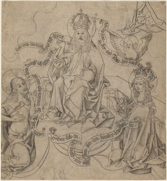 This anonymous drawing depicts the Madonna and Child adored by two saints. Here, we see the Madonna, a timeless symbol of maternal love and divine grace, seated regally with the Christ Child, and a rosary, symbolizing faith. Consider the motif of the rosary, a string of beads, each bead a prayer. This object has roots stretching back to ancient prayer traditions—Buddhist malas and Muslim tasbihs come to mind. Such objects are not merely tools for counting prayers. They embody a deeper, subconscious desire to quantify and control the spiritual realm. The Madonna's serene gaze invites introspection, stirring deep-seated emotions. Just as the saints in this drawing offer their devotion, we, too, are drawn into a cycle of reverence and reflection. The sacred act of prayer, represented by the rosary, echoes through centuries, resurfacing in myriad forms across cultures. The artist taps into a wellspring of collective memory, engaging us on a visceral, emotional level.