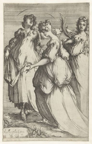 Editor: This is Jacques Bellange's "Three Marys at the Tomb," made sometime between 1575 and 1616. It's an intaglio print in ink. I'm struck by how theatrical the scene feels, almost staged. What resonates with you as you look at this image? Curator: Theatrically charged, yes, absolutely. The elongated figures, the dramatic lighting – it all speaks to the Mannerist style and its emphasis on artifice. Bellange masterfully uses symbolism to evoke profound emotion. Notice the angel, bathed in light, its presence not just announcing the Resurrection, but representing divine grace. What emotional weight does that symbol carry for you? Editor: I see what you mean. It feels like hope, but also maybe a challenge to understand something beyond words. But then, what about the other figures deeper in the image, near the tomb, are they witnessing something as well? Curator: Precisely. They are echoes, reminders of doubt, disbelief perhaps. Remember, visual symbols function within a cultural memory. The tomb isn't just a physical space; it's a repository of shared grief and faith. And consider the three Marys – their poses, their gestures. They embody different facets of mourning and questioning, aspects of our human selves wrestling with faith. Do their garments speak to you, do you think? Editor: I hadn't considered that. It's as if the cloth enfolds them, shrouds them. Curator: Clothing, then, symbolizes status but simultaneously alludes to humility and even mortality. We can interpret so much, can't we, from simply observing. It shows how the image continues to resonate across centuries. Editor: I definitely see so many layers I didn't notice before. This has transformed the way I look at symbolic images. Curator: And for me, thinking through it with you highlights the continuous dialogue between art, belief, and our own personal experiences.