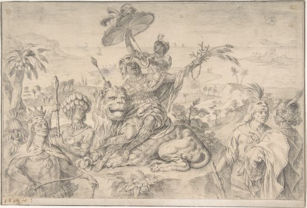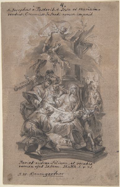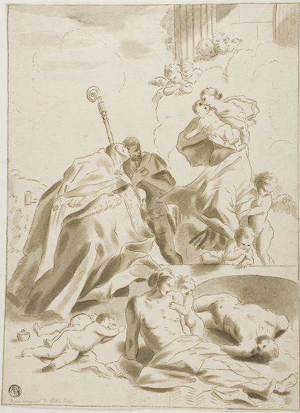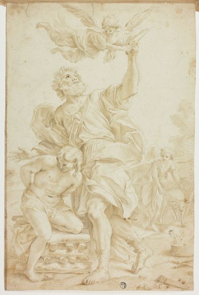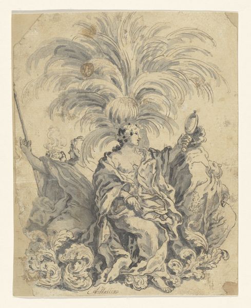 Giovanni Battista Gaulli created this drawing, "Allegorical Figure of Faith," using pen and brown ink with brown wash over black chalk. These materials, common in baroque drawings, allowed for a dynamic interplay of light and shadow. The application of brown wash gives the figure a sense of depth, particularly in the swirling clouds, which are rendered with a fluidity that seems almost effortless. But of course this belies great skill. Wash is a demanding medium; it requires control and a deep understanding of tonal values. The artist manipulates the wash to create a sense of volume in the figure's robes, highlighting the folds and contours. The linear precision of the pen is essential to provide definition. This drawing showcases the skill involved in its production. It reflects the artistic conventions of the time, and the social and cultural values associated with religious faith. It reminds us that even seemingly simple works on paper can embody complex ideas and techniques, blurring the lines between craft and fine art.